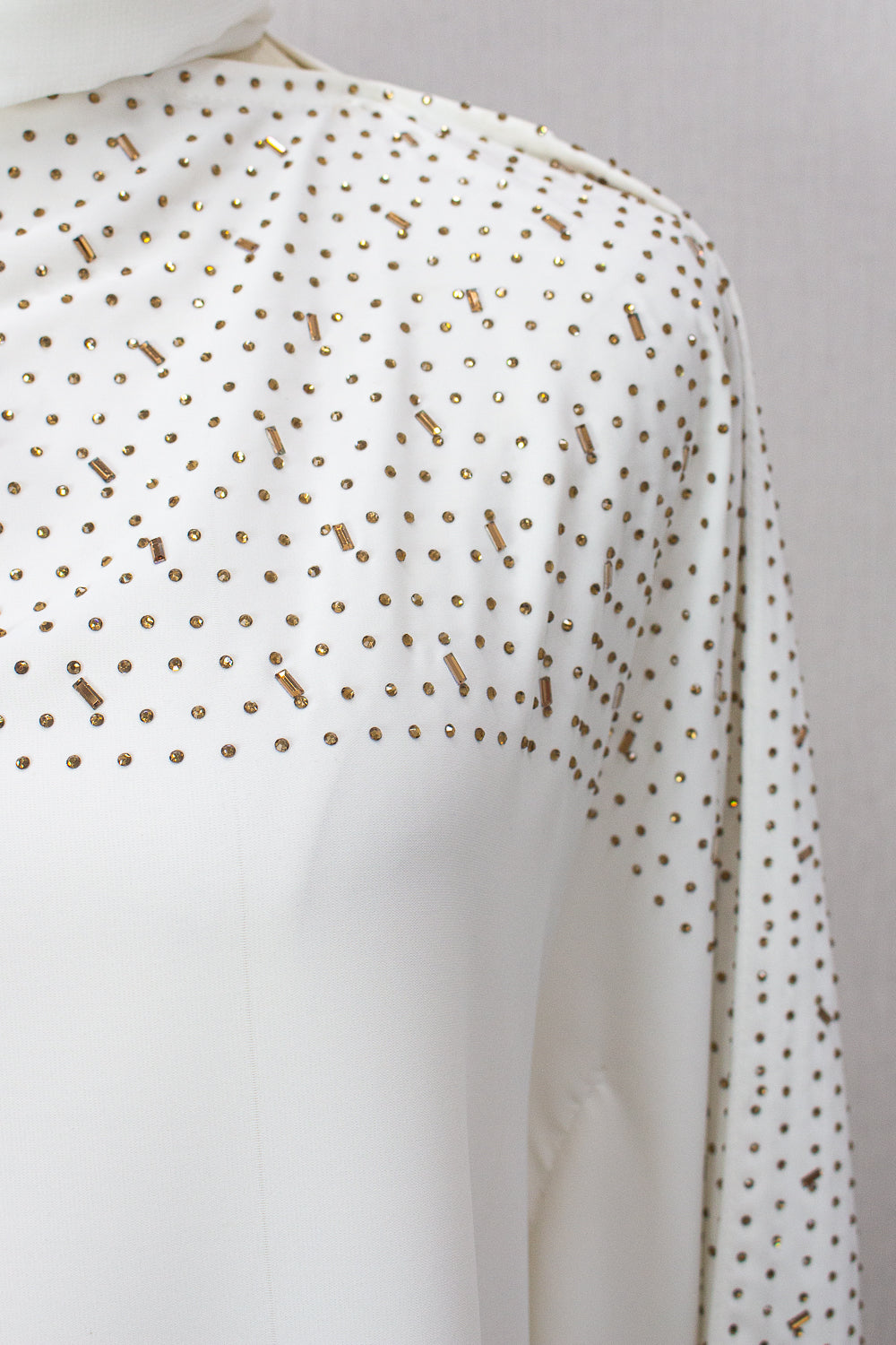 Its flowy silhouette drapes beautifully, while the delicate bead embellishments from the shoulder down to the arm and wrist add a touch of glamour and grace. Thoughtfully designed with clip-on buttons on both shoulders, it ensures easy wear and a neat head opening without compromising style.