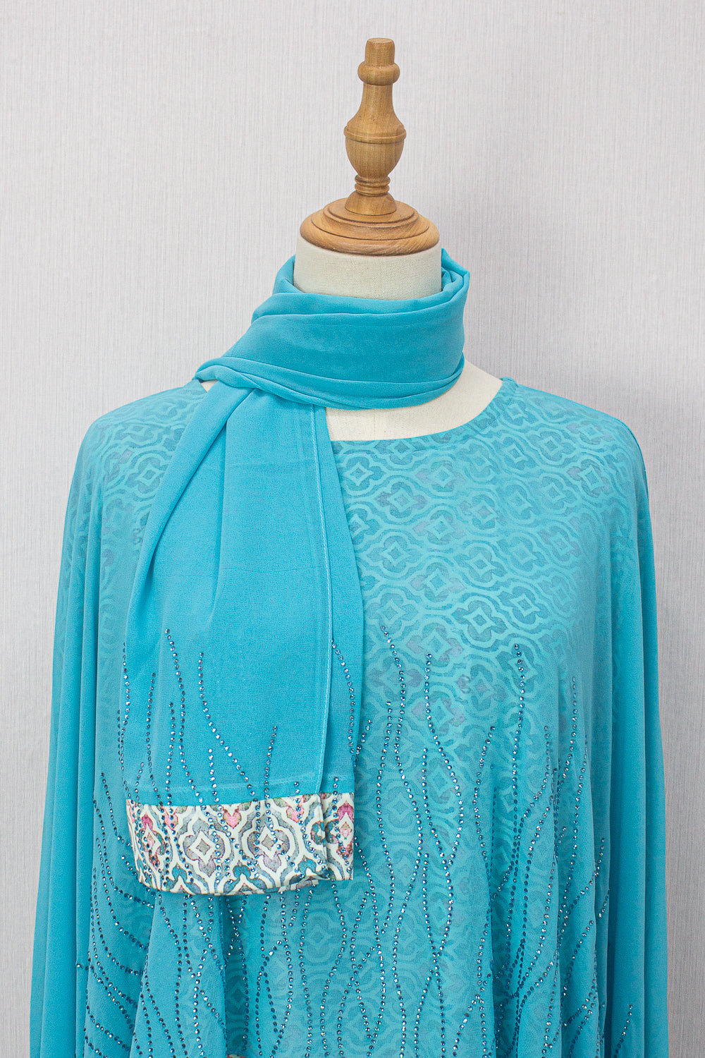 Each set comes with a matching 2-meter chiffon hijab, thoughtfully designed with one end adorned in the same printed material as the abaya, tying the entire look together in perfect harmony.