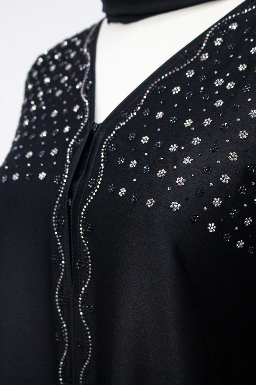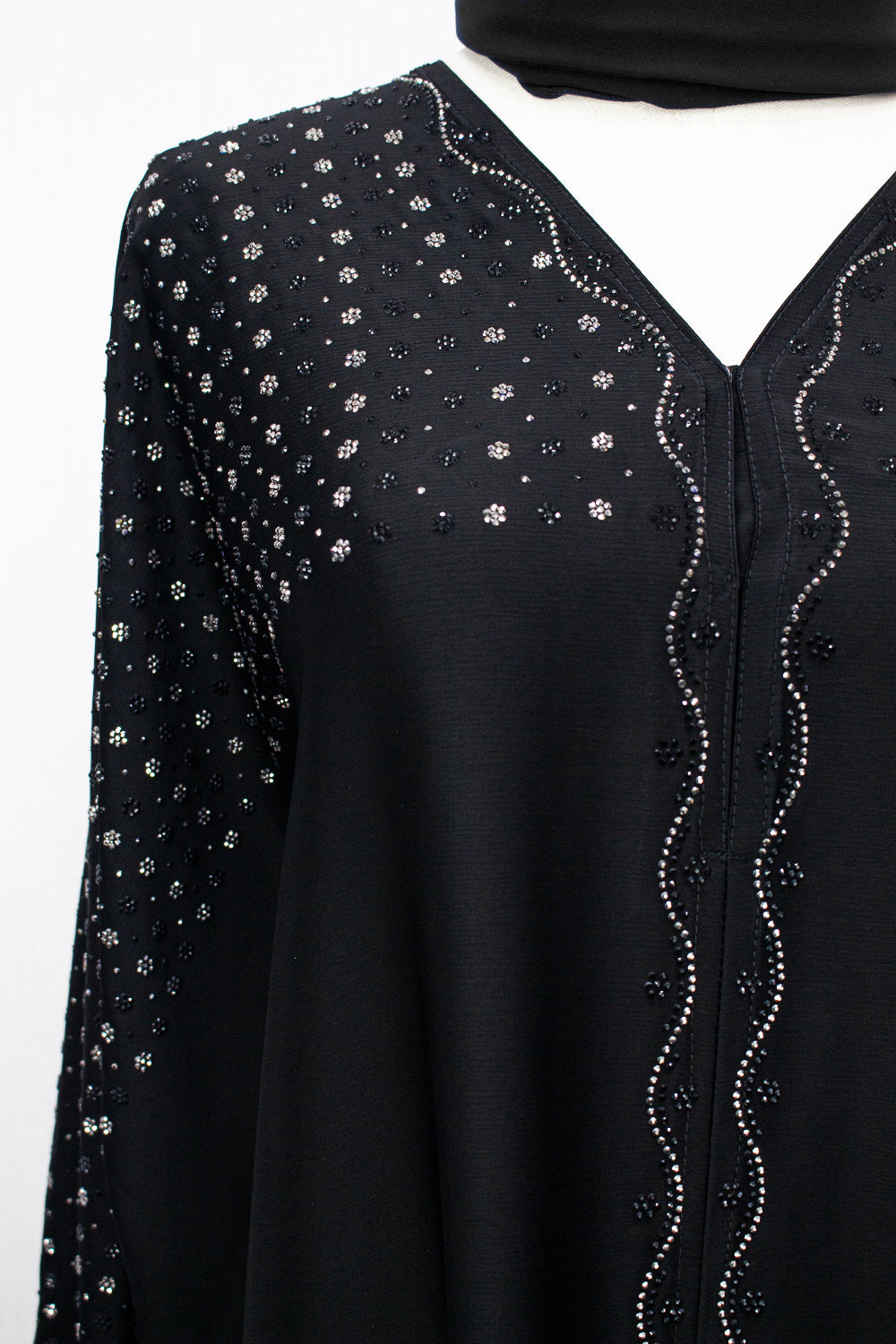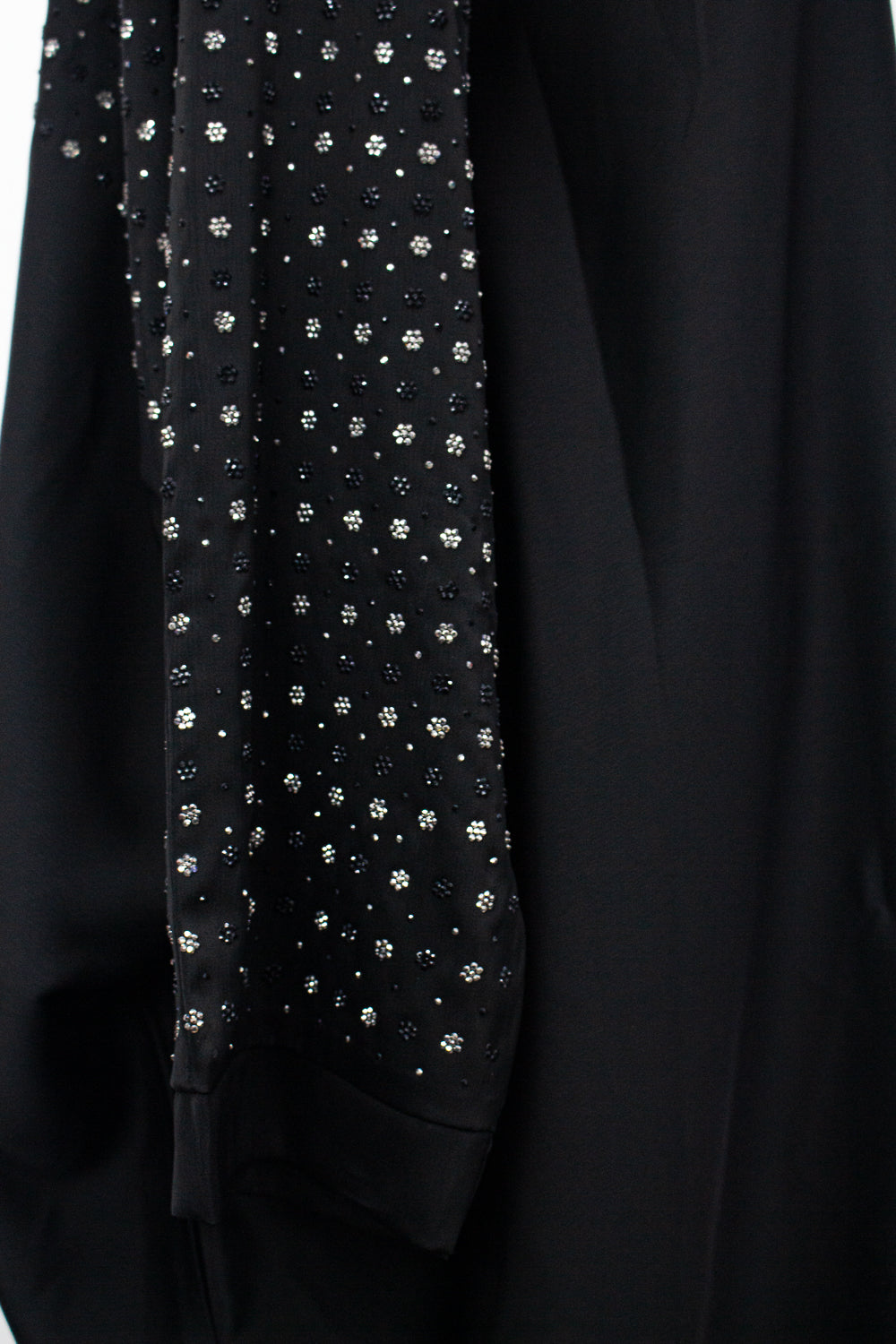 Adorned with delicate crystal embellishments shaped into mini daisies, the detailing blooms from the neckline down to the sleeves, adding just the right touch of sparkle without overpowering its refined silhouette.