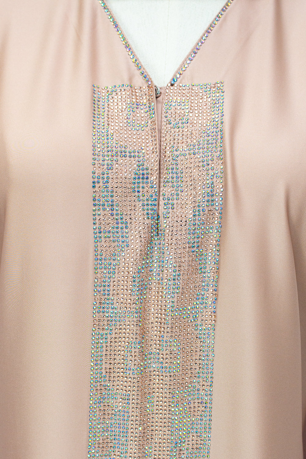The straight-cut silhouette offers a sleek and timeless look, while the exclusive crystal embellishment cascading from the neckline down to the hem adds a touch of opulence and sparkle to every movement. Designed with a button at the neck, it provides effortless wear and comfort without compromising style.